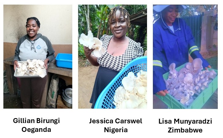 In Januari 2025 zijn er drie nieuwe ondernemers gestart en zij hebben een gift ontvangen van € 700. Zij komen uit Nigeria, Oeganda en Zimbabwe en hebben in het voorjaar een training gevolgd en allerlei voorbereidingen getroffen om aan de slag te gaan. Deze zomer hebben zij hun eerste oesterzwammen geoogst.